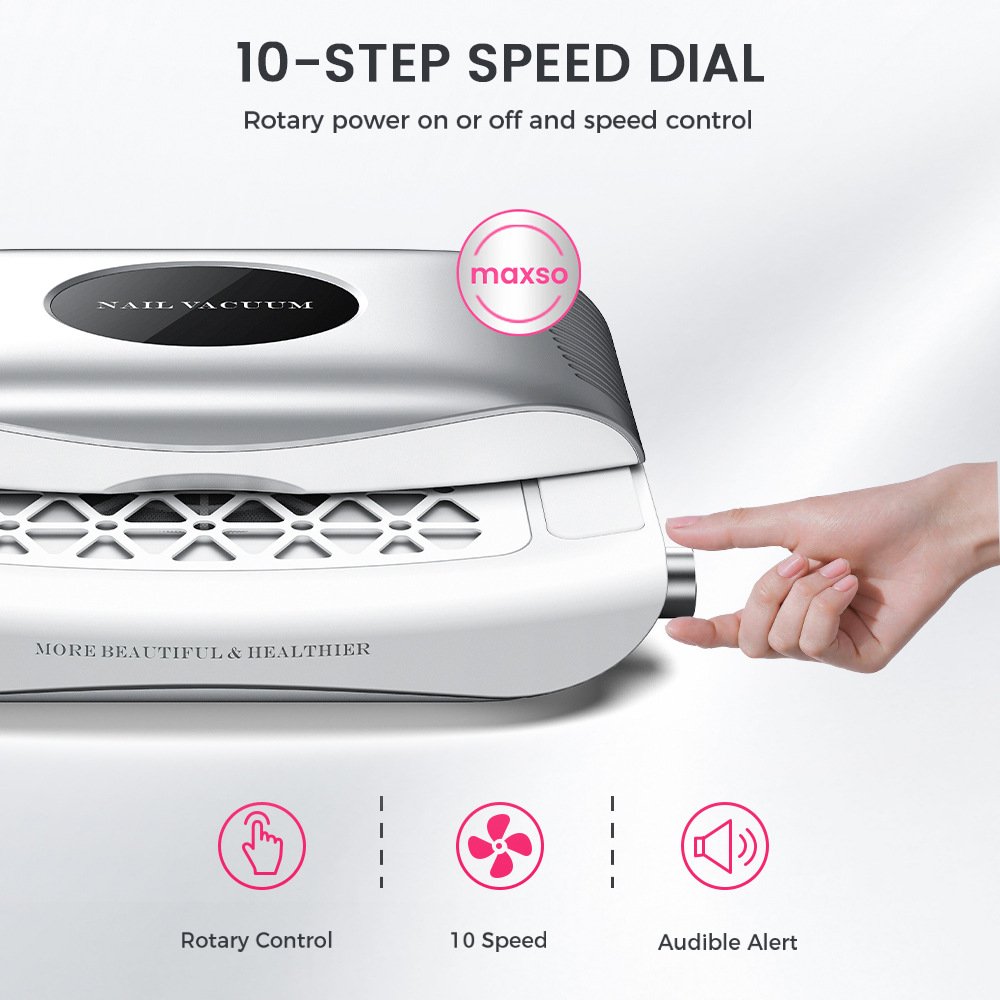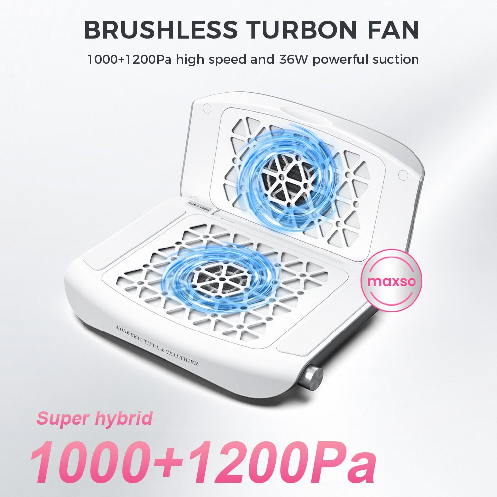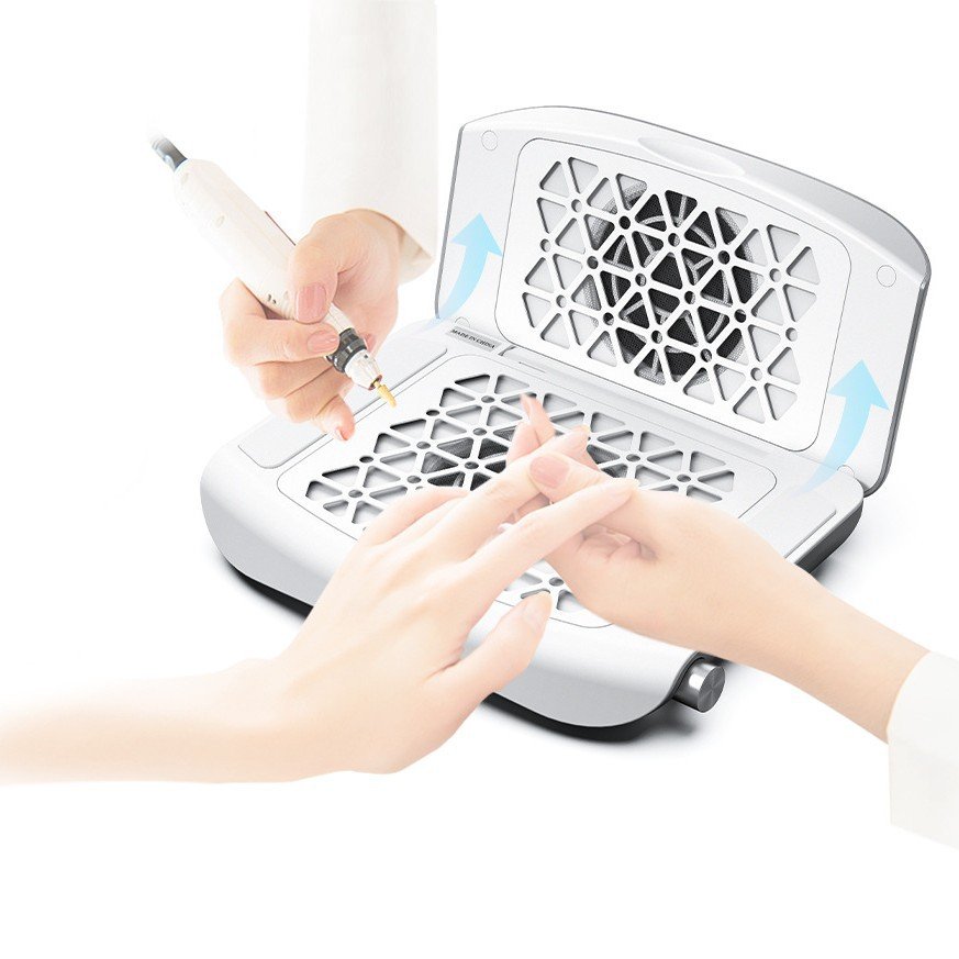 Intake velocity: 4.5 m/s × 2 – captures dust, acrylic filings, and gel residue from both hands at once.